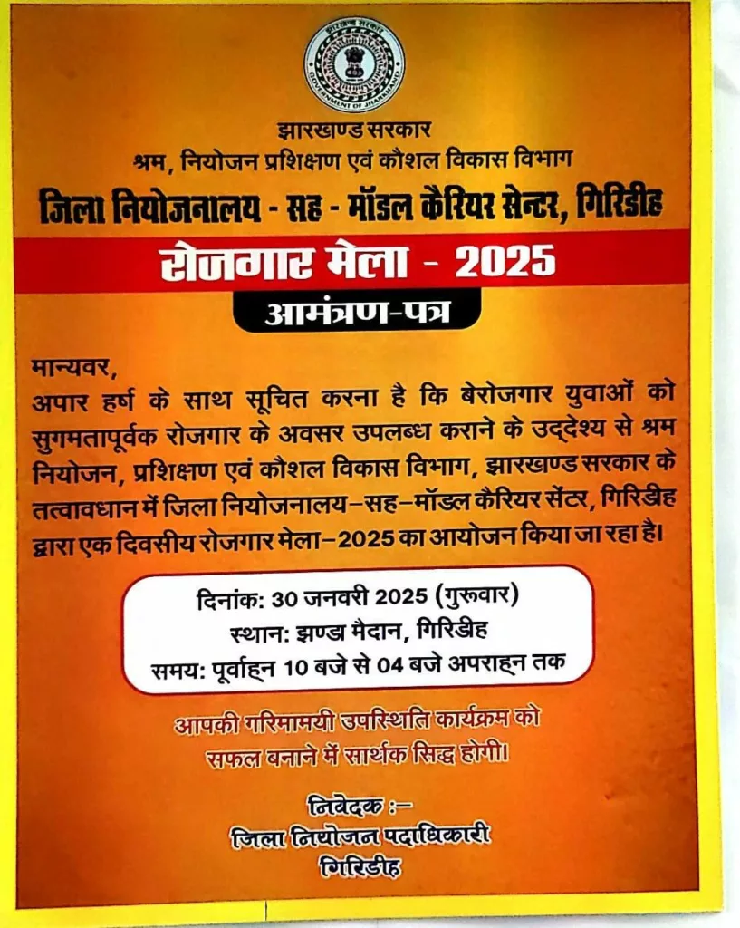 गिरिडीह। गुरुवार को समय पूर्वाह्न 10:00 बजे से अपराह्न 04:00 बजे तक झंडा मैदान, गिरिडीह में श्रम नियोजन, प्रशिक्षण एवं कौशल विकास विभाग, झारखण्ड सरकार के तत्वावधान में जिला नियोजनालय-सह-मॉडल कैरियर सेंटर, गिरिडीह द्वारा एक दिवसीय रोजगार मेला-2025 का आयोजन किया जा रहा है।